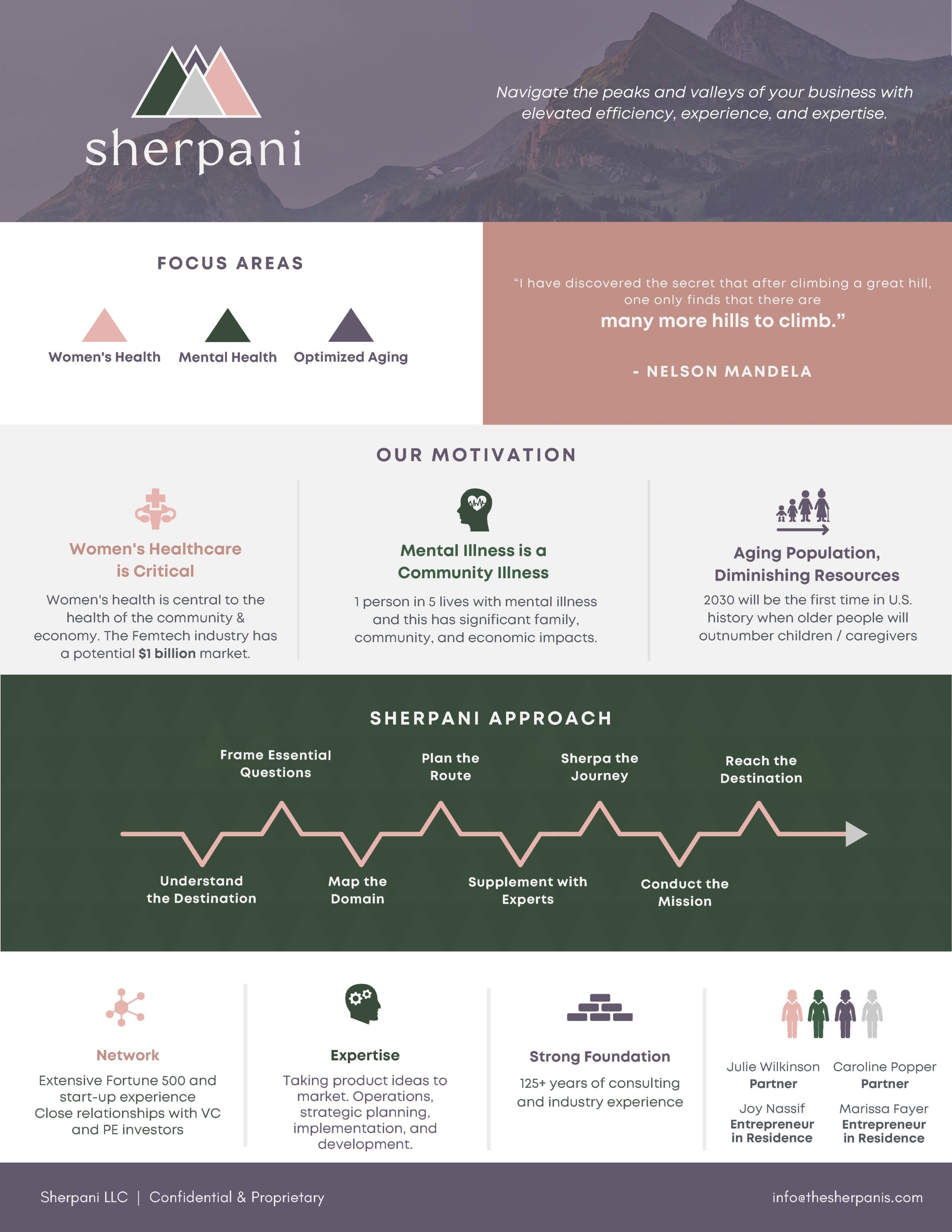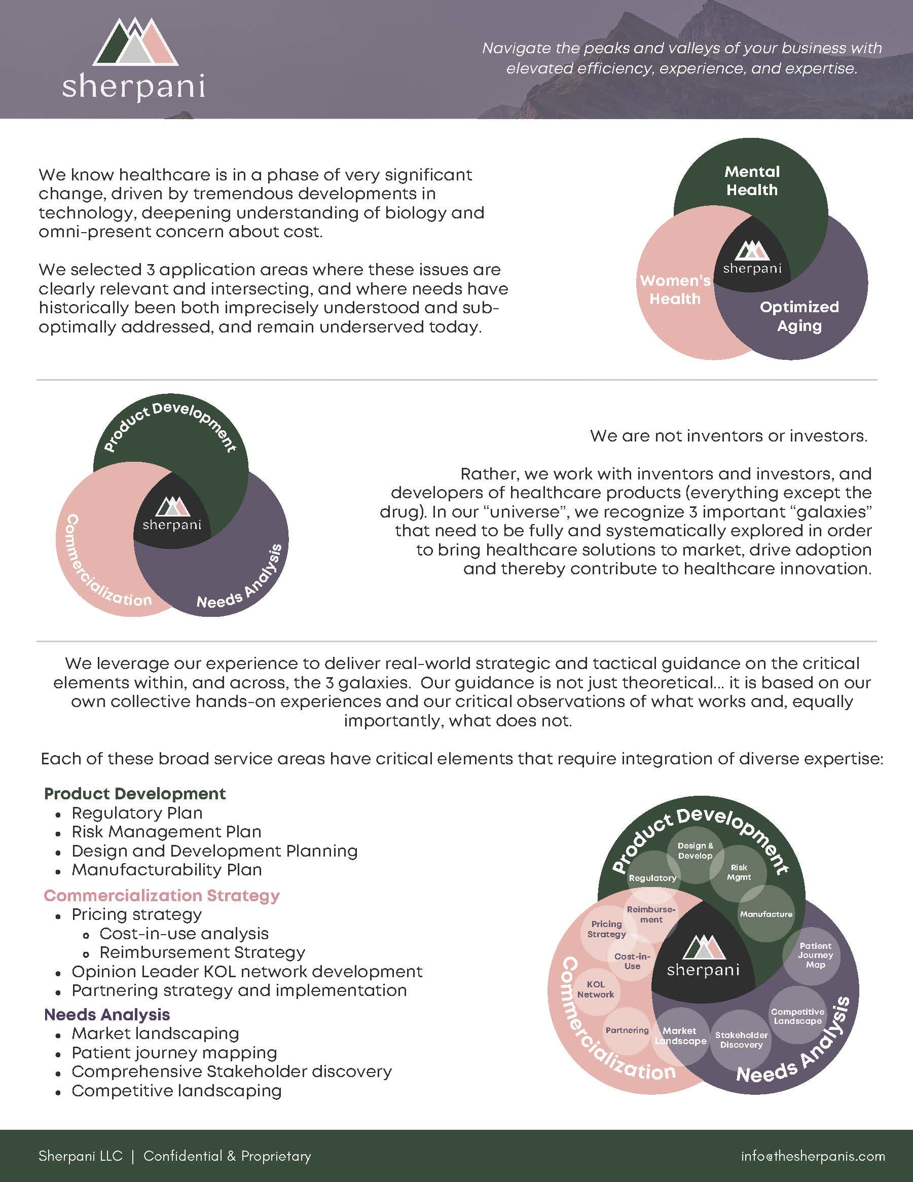 Sherpani consultants and advisors work with healthcare product inventors, investors, and developers to fully and systematically explore the 3 "must have" areas for bringing healthcare solutions to market, drive adoption, and thereby contribute to healthcare innovation .... Product Development, Commercialization, Need Analysis. Our experiences deliver real-world strategic and tactical guidance to you that aren't just theoretical, rather it is based on our real hands-on experiences and our critical observations of what works ... and equally importantly ... what does not.